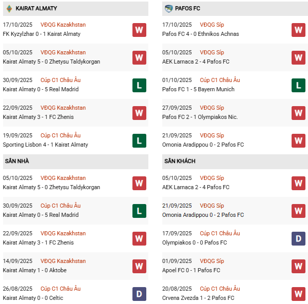 Thống kê phong độ Kairat Almaty vs Pafos FC: