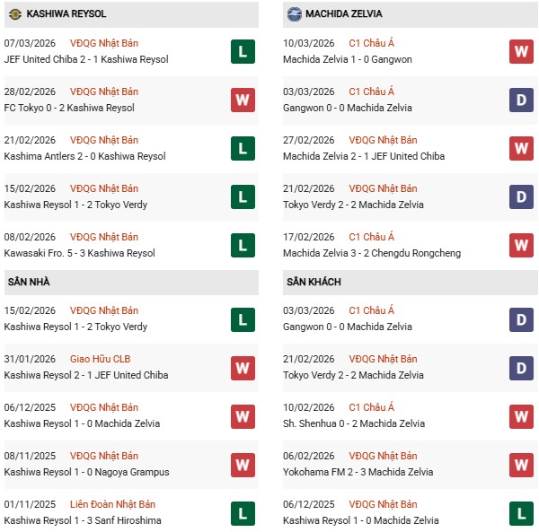 Lần gần nhất Zelvia bị xếp dưới là vào ngày hạ màn J1-League 2025. Hôm đó, họ phải làm khách của ... Kashiwa Reysol. Chung cuộc, Zelvia phải nhận thất bại 0-1. Khép lại giải đấu, Reysol giành ngôi á quân, thành tích cao nhất trong lịch sử tham dự J1-League (còn Machida đứng thứ 6).