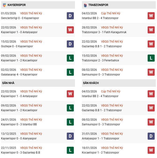 Phong độ thăng hoa của Trabzonspor: Đội khách đang sở hữu chuỗi 3 chiến thắng liên tiếp và thắng 4/5 trận gần nhất trên mọi đấu trường. Mới nhất, họ vừa đánh bại Istanbul BB với tỷ số 4-2 tại Cúp Thổ Nhĩ Kỳ vào ngày 04/03/2026.