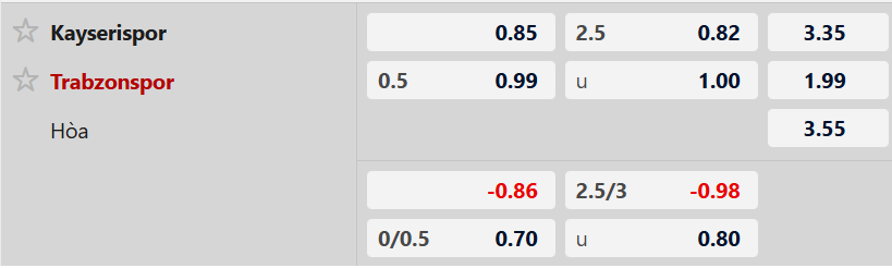 Thông tin tỷ lệ kèo Kayserispor vs Trabzonspor: