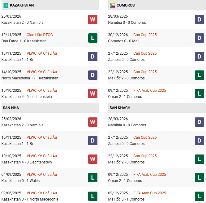 Thống kê phong độ Kazakhstan vs Comoros: