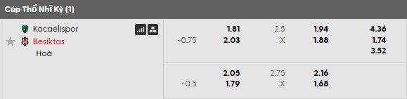Thông tin tỷ lệ cược Kocaelispor vs Besiktas: