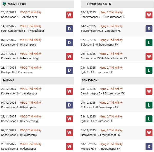 - Trên sân nhà, Kocaelispor thắng 3, hòa 1 trước Erzurumspor.