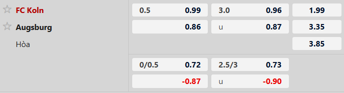 Koln thắng kèo 4/5 trận đấu mới đây chạm mặt Augsburg. Koln thắng kèo 4/6 trận đấu đã đá tại giải VĐQG Đức mùa này. Trên sàn giao dịch châu Á, Augsburg là lựa chọn mạo hiểm khi thua kèo 4/5 trận đấu vừa rồi.