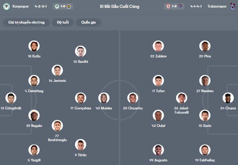 Đội hình dự kiến Konyaspor vs Trabzonspor: