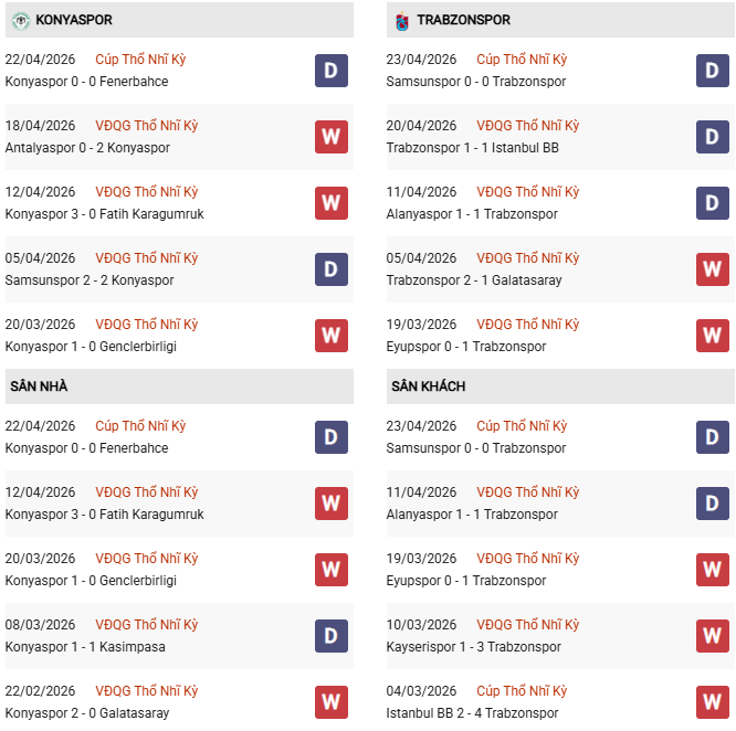 Hiệp 1 không có bàn thắng: 6/10 trận gần nhất của Konyaspor và 5/6 trận vừa qua của Trabzonspor đều không có bàn thắng nào trong hiệp 1.