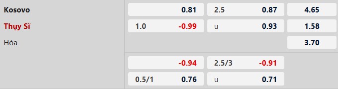Thông tin tỷ lệ bóng đá Kosovo vs Thụy Sĩ: