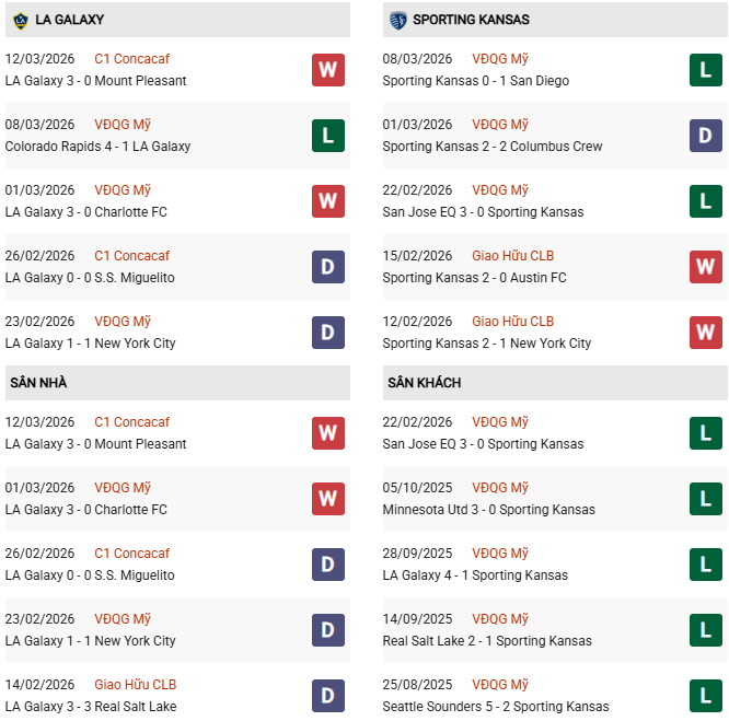 Thống kê phong độ LA Galaxy vs Sporting Kansas: