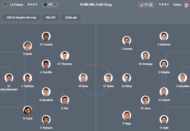 Đội hình dự kiến LA Galaxy vs Toluca: