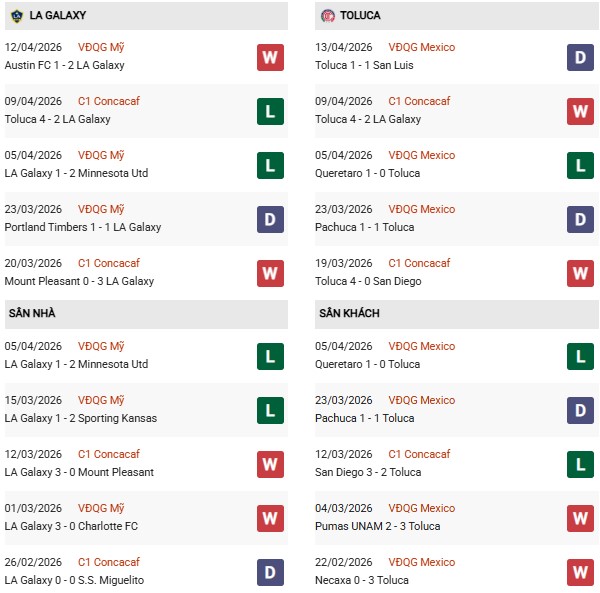 - LA Galaxy toàn thua cả 2 trận đối đầu Toluca gần đây.