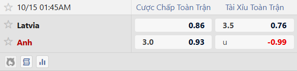 Anh có thành tích toàn thắng cả 5 trận vòng loại mà chưa để lọt lưới bàn nào. Ở chiều ngược lại, Latvia lại cho thấy sự bế tắc trên hàng công khi tịt ngòi trong 3/5 trận gần nhất. Đáng chú ý, 3/4 trận gần đây của Tam Sư đều kết thúc với trên 3.5 bàn thắng. Với tỷ lệ Tài Xỉu 3 1/2, kịch bản nổ Tài được đánh giá rất cao.