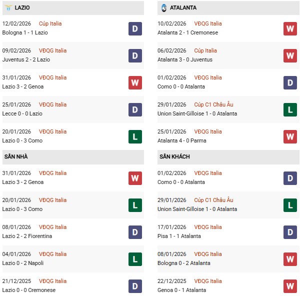 Thống kê phong độ Lazio vs Atalanta: