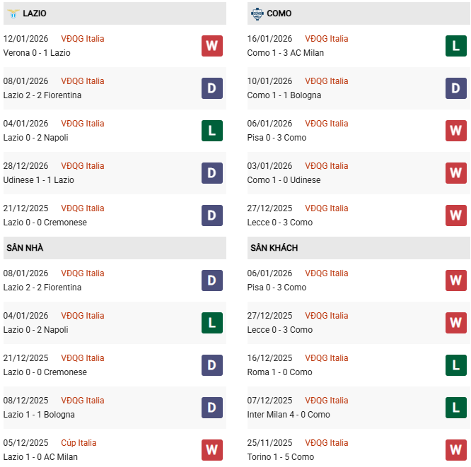 Thống kê phong độ Lazio vs Como: