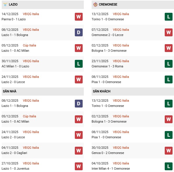 - Lazio toàn thắng 3 trận đối đầu Cremonese gần đây.
