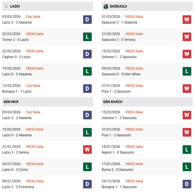 - 5 lần gần nhất gặp nhau, Lazio thắng 3 thua 1 và hòa 1 trước Sassuolo.