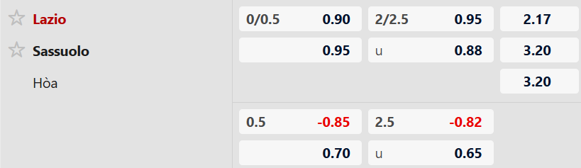 Thông tin tỷ lệ kèo Lazio vs Sassuolo: