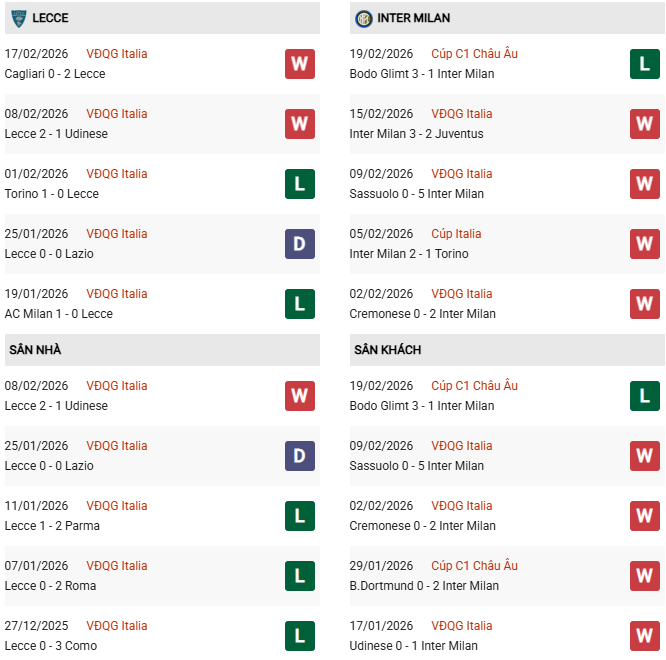 - Trên sân nhà, Lecce thắng 2, thua 5 trước Inter Milan.