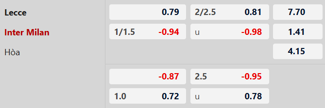 Inter thắng theo châu Á hiệp 1: 5 trận gần đây ở giải nội địa khi Inter nhường đối phương 1 1/4 bàn trở lên, 100% thầy trò Cristian Chivu dẫn bàn khi bước vào giờ nghỉ tức thắng theo châu Á hiệp 1. Trong 10 trận sân nhà vừa qua, Lecce chỉ có đúng 2 lần thắng theo châu Á hiệp 1. 3 lần chạm trán gần nhất trên sân Via del Mare, Inter đều dẫn 1-0 hoặc 2-0 trong 45 phút đầu.