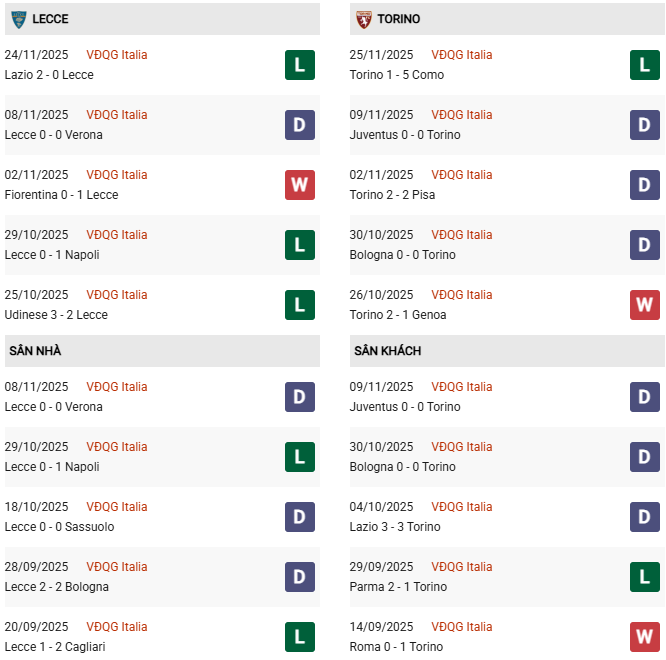 Thống kê phong độ Lecce vs Torino: