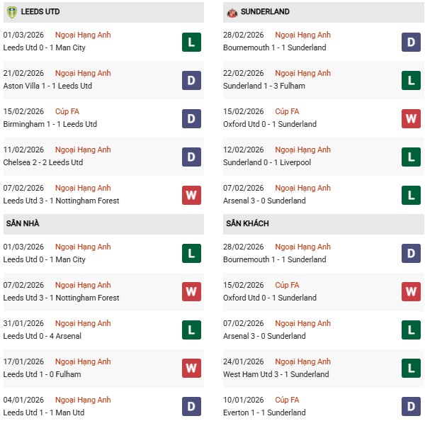 Ở vòng đấu mới kết thúc của Ngoại hạng Anh 2025/26, Leeds lẫn Sunderland đều không thắng. Trong khi Leeds bại trận trước Man City thì Sunderland lại chỉ có 1 điểm trước Bournemouth. Lúc này, trên BXH, Leeds xếp thứ 15 với 31 điểm còn Sunderland đứng thứ 11 khi sở hữu 37 điểm.