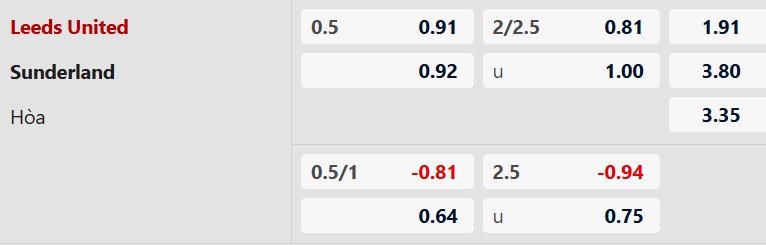 Thông tin tỷ lệ bóng đá Leeds vs Sunderland: