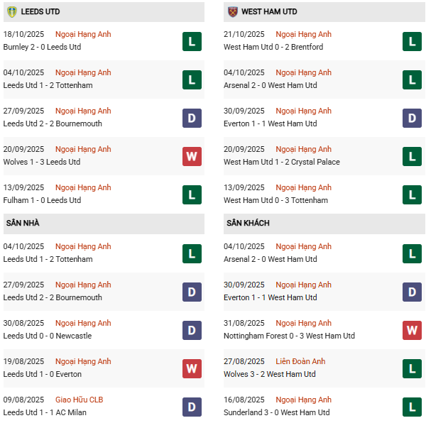- Leeds thắng 2, hòa 3, thua 5 trong 10 trận gặp West Ham gần đây.