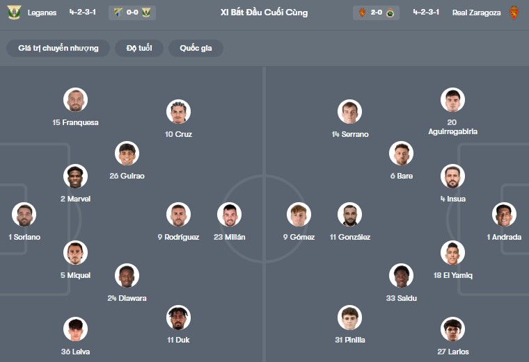 Đội hình dự kiến Leganes vs Zaragoza: