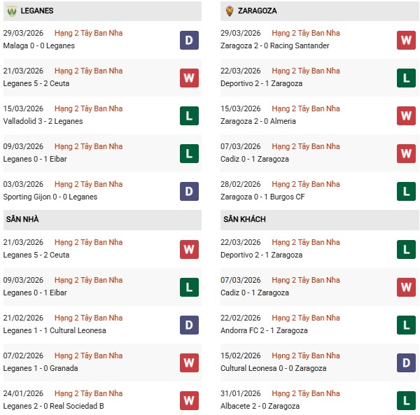 Thống kê phong độ Leganes vs Zaragoza: