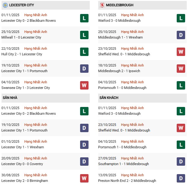 - Trên sân nhà, Leicester thắng 3, thua 1 trước Middlesbrough.