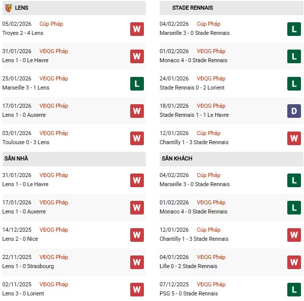 - Trên sân nhà, Lens thắng 4, thua 2 trước Rennes.