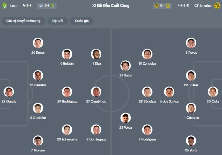 Đội hình dự kiến Leon vs Club America: