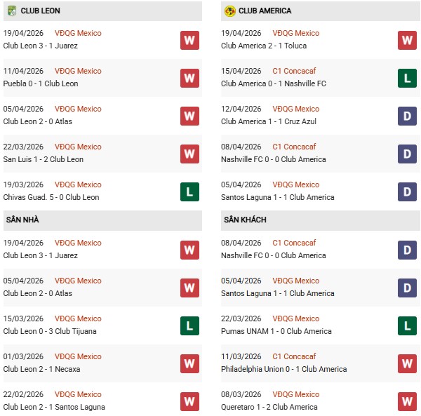 Thống kê phong độ Leon vs Club America: