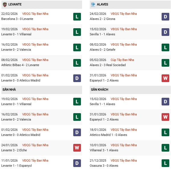 Thống kê phong độ Levante vs Alaves: