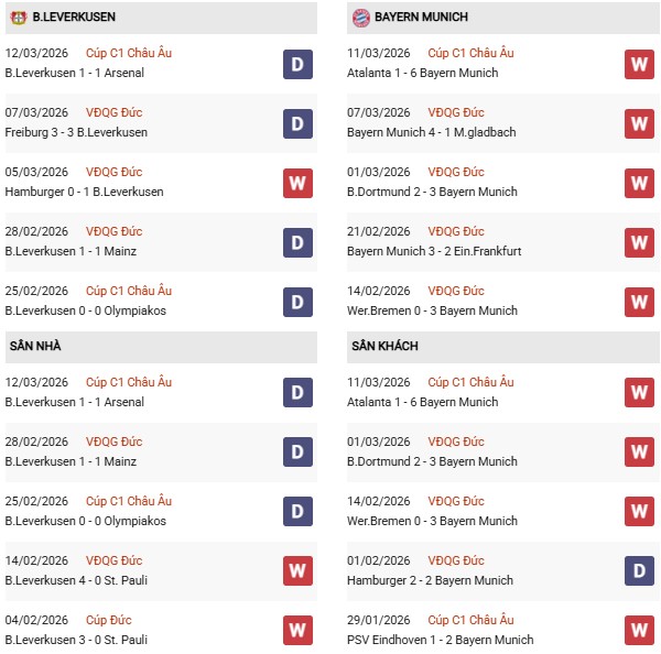 Thống kê phong độ Leverkusen vs Bayern Munich: