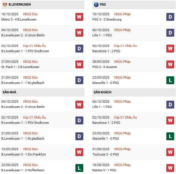 Thống kê phong độ Leverkusen vs PSG: