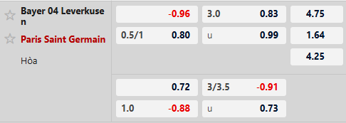 PSG vẫn là đội được đánh giá cao hơn rất nhiều với kèo chấp 3/4 bàn. 2 lần chạm mặt ở cúp châu Âu trong quá khứ, PSG toàn thắng trước Leverkusen. Dù phải làm khách tại Đức ở thời điểm này nhưng với sức mạnh nhân sự quá vượt trội, không ngạc nhiên nếu PSG vẫn có thể thu về 3 điểm trọn vẹn.