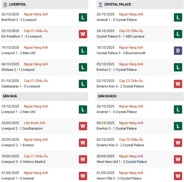 Thất bại ấy kéo dài chuỗi 4 trận không thắng của Palace, trong đó có 3 trận thua kể từ đầu tháng. Dù vậy, Palace vẫn có thể tự tin khi từng 3 lần liên tiếp đánh bại Liverpool trong năm nay – từ Community Shield đến chiến thắng tại Premier League hồi tháng trước. Đặc biệt, họ chưa từng thua tại Anfield kể từ tháng 9/2021.