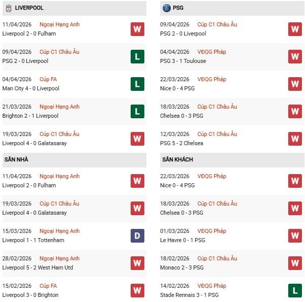 - Trên sân nhà, Liverpool thắng 1, thua 1 trước PSG.