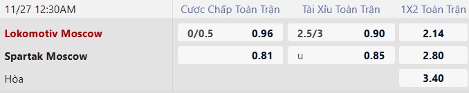 Thông tin tỷ lệ cược Lokomotiv vs Spartak Moscow: