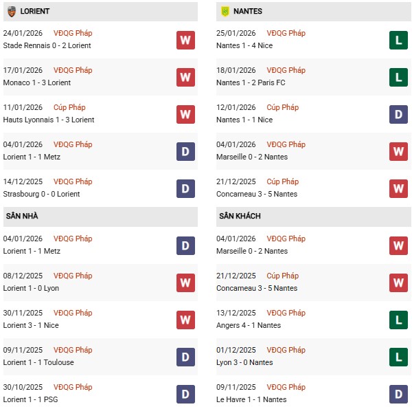 Thống kê phong độ Lorient vs Nantes: