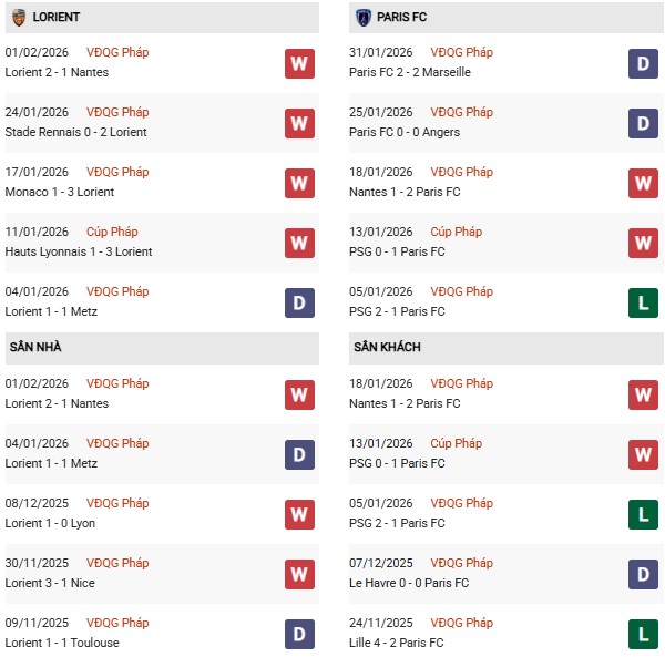 Xét phong độ, Lorient đang trong giai đoạn thăng hoa nhất kể từ đầu mùa 2025/26: thắng 4 trận liên tiếp. Dẫu vậy điều thú vị là tới 3 khúc khải hoàn được cất lên nơi đất khách. Phía đối diện, Paris FC tuy không hoành tráng tương tự nhưng cũng đã 4 trận liền không phải nếm mùi thất bại (thắng 2).