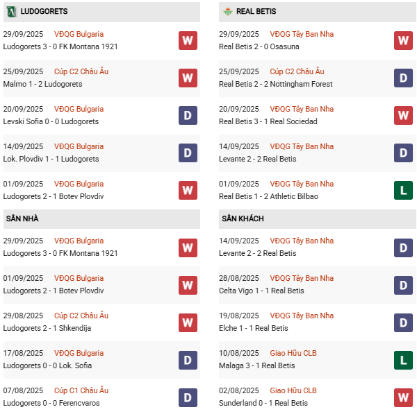 - Ludogorets toàn thắng cả 2 trận gặp Real Betis gần đây.