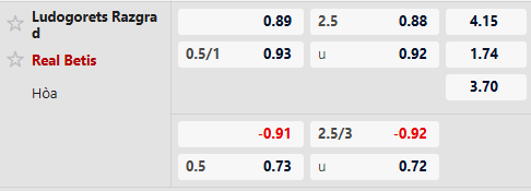Real Betis được xếp cửa trên với tỷ lệ chấp 3/4 bàn. Đội chủ nhà đang sở hữu chuỗi 6 trận bất bại trên mọi đấu trường. Ở chiều ngược lại, Betis cũng duy trì phong độ ổn định với 4 trận liền không thua. Tuy nhiên, với sự khác biệt về chất lượng đội hình cùng kinh nghiệm tại đấu trường châu Âu, đại diện La Liga được đánh giá nhỉnh hơn. Vì vậy, lựa chọn kèo trên vẫn là phương án đáng tin cậy.