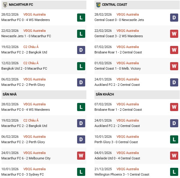 - Macarthur thắng 2, hòa 4, thua 4 trong 10 trận gặp Central Coast gần đây.