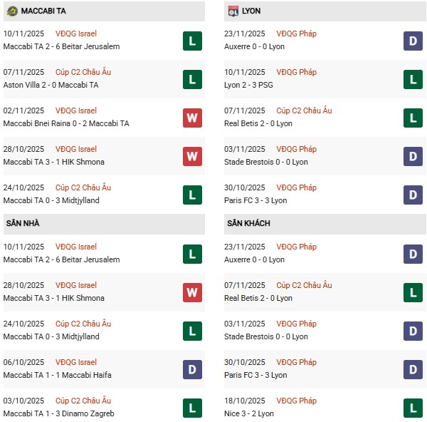 Thống kê phong độ Maccabi Tel Aviv vs Lyon: