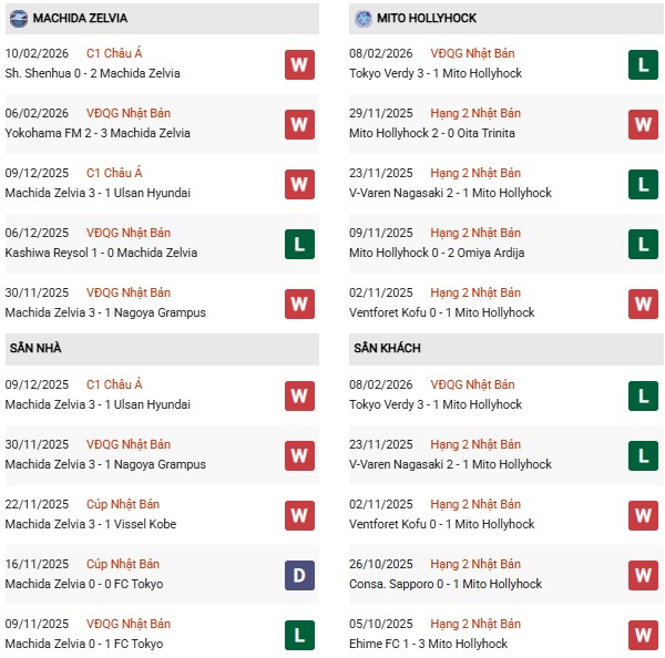 Phong độ 10 trận gần nhất của Mito là tương đối cân bằng với 5 chiến thắng, 1 trận hòa và 4 thất bại. Trên sân khách, họ thắng 4, hòa 3 và thua 3 trong 10 chuyến xa nhà gần đây – con số không quá tệ nhưng vẫn thiếu tính ổn định khi đối đầu các đội có hàng công mạnh. Trước một Machida đang đạt điểm rơi phong độ, Mito nhiều khả năng sẽ lựa chọn cách tiếp cận thận trọng, chờ đợi cơ hội phản công.