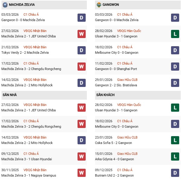 - Machida Zelvia thắng 1, hòa 1 trong 2 trận gặp Gangwon gần đây.