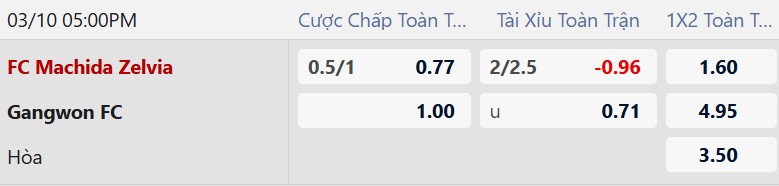 Thông tin tỷ lệ kèo Machida Zelvia vs Gangwon: