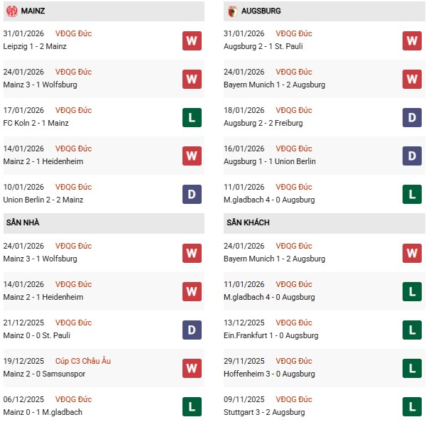 Vào lúc này, Augsburg đang đứng cao hơn Mainz trên BXH Bundesliga 202526 nhưng phong độ trong năm 2026 lại thua kém chút đỉnh, trong đó thất bại duy nhất diễn ra nơi đất khách. Thực ra sau khi thua trắng chủ nhà Gladbach 4 bàn không gỡ, Ausburg từng gây tiếng vang lớn bằng màn hạ gục Bayern Munich ngay tại sào huyệt của "Hùm xám".