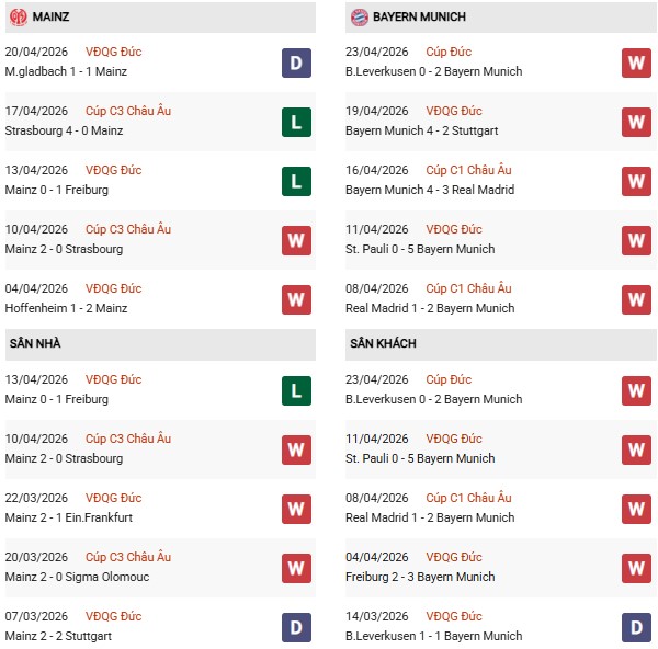 Thành tích đối đầu Mainz vs Bayern Munich: